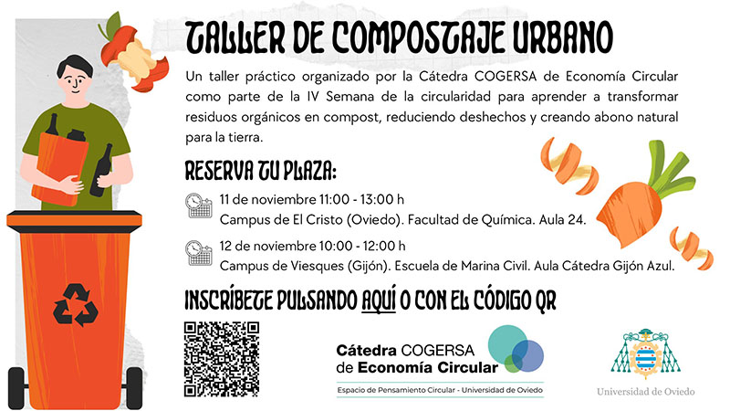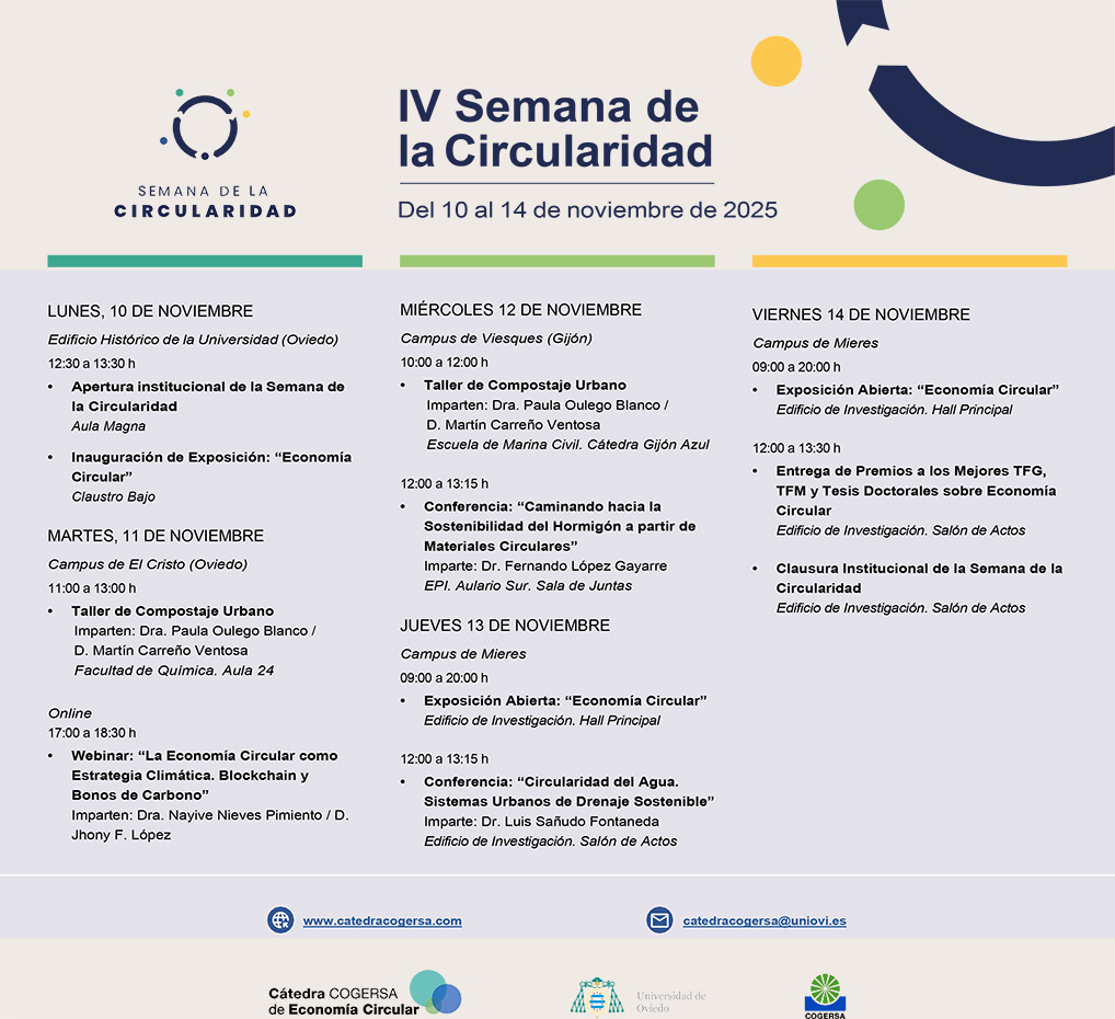 La Cátedra COGERSA de Economía Circular celebra anualmente la Semana de la Circularidad. Un evento que pretende consolidarse como referente en la Universidad de Oviedo para fomentar el conocimiento y el debate sobre los retos que la economía circular supone para la sociedad asturiana y para la Universidad.