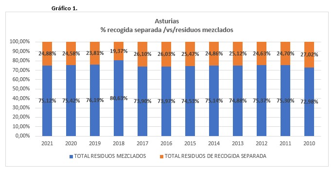 • El porcentaje de recogida separada en Asturias en 2021, 24,88%, apenas ha subido respecto a 2020, 24,58%, y ha subido un punto respecto a 2019, 23,81%, año prepandemia. Tabla 1. Gráfico 1
