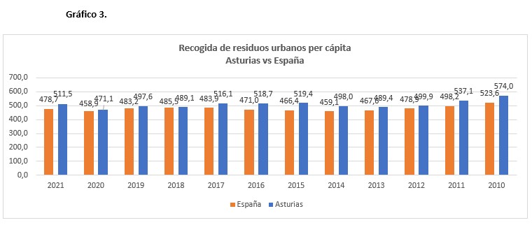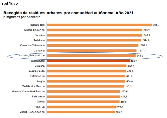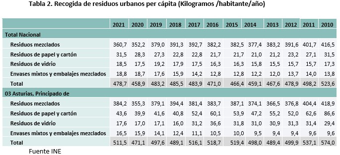 • En términos per cápita, en Asturias, en 2021 se recogieron 511,5 kilogramos de residuos urbanos por persona, un 8,58% mas que en 2020 y un 2,79% mas que en 2019 (año prepandemia). Tabla 2.