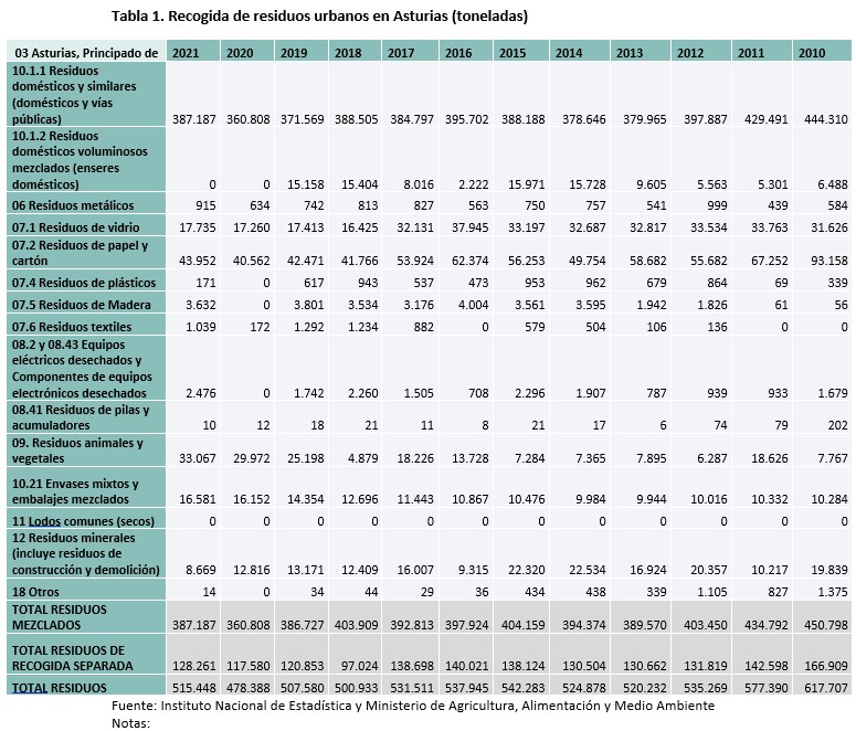 Estadísticas INE sobre recogida y tratamiento de residuos urbanos 2021 en Asturias